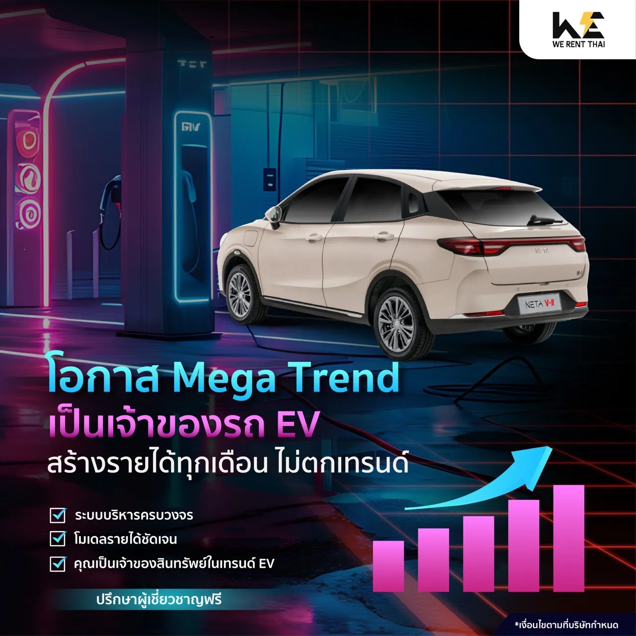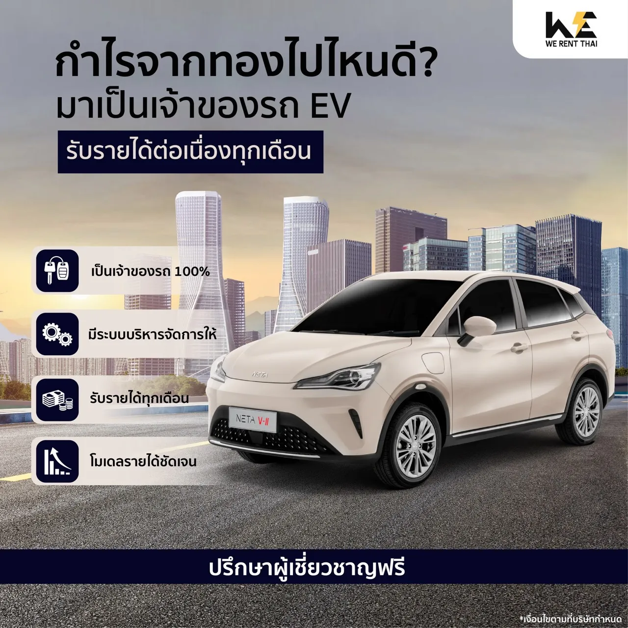 We Rent Thai คือบริษัทบริหารจัดการกองรถยนต์ไฟฟ้า (EV Fleet Management) ที่ดำเนินงานครบวงจร ตั้งแต่การตลาด การบริหารการเช่า ไปจนถึงการซ่อมบำรุงและดูแลสินทรัพย์ทุกขั้นตอน
